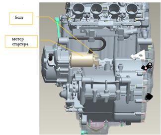 3.3 стартер электромашины 3.3.1 демонтаж Ослабьте 2 крепящих болта мотора стартера, достаньте мотор стартера.
