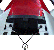 Источником света задней фары является LED, при замене следует менять лампу целиком. (1) Снимите пассажирское сиденье и водительское сиденье (2) Снимите 2 болта крепления защитного щитка крышки задней фары ①, затем отодвиньте назад щиток крышки задней фары, так чтобы его можно было снять.