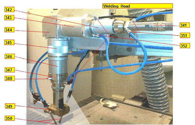Для сварочной головки проверку и мягкую очистку можно выполнять на следующих компонентах (см. рисунок): _кончик оптико-волоконного кабеля (341), см. Руководство по лазеру _коллиматор (343) _фокусирующее устройство (345) _защитное стекло (348)