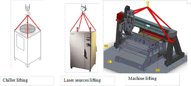 ПОГРУЗОЧНЫЕ-РАЗГРУЗОЧНЫЕ РАБОТЫ – ТРАНСПОРТИРОВКА - МОНТАЖ Транспортировка и монтаж (только персоналом производителя) лазерных источников и холодильника представлены в соответствующих руководствах.