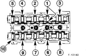 • Затягивайте болты крышек подшипников распред- валов в последовательности, обратной по сравне- нию с демонтажом. Затягивайте болты поэтапно, каждый раз дозатягивая еще на 1/2 оборота, не допуская перекоса распредвалов. В заключение за- тяните все болты с моментом сначала 10 Нм, а за- тем 20 Нм.