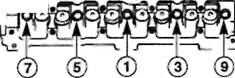 • Откручивайте, используя длинный торцовый Тогх- ключ (размер Т55), болты головки блока цилин- дров, начиная с болта 10, в обратной последовательности.