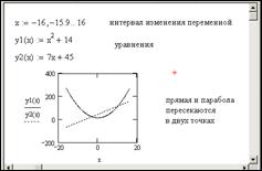 Для того чтобы отметить на графике точки пересечения параболы и прямой, координаты точек, найденные при решении системы, введем по оси Ох (значения х) и по оси Оу (значения у) через запятую. В окне форматирования графика во вкладке Traces для trace3 и trace4 изменим: тип графика — points, толщина линии — 3, цвет — черный (рис. 4.7).