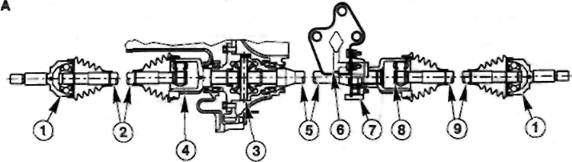 1 - Поворотный кулак 2 - Кулак карданного вала 3 • Левый карданный вал 4 • Ведущий шарнир