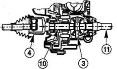 А - С коробкой передач МТХ-75 1 ■ Кулак кардана с наружным шарниром 2 - Левый карданный вал 3 - Дифференциал 4 - ведущий шарнир {"Трипоид"- шарнир) с наружными шлицами 5 - Промежуточный вал (МТХ-75) 6 - Кронштейн опоры промежуточного вала 7 - Опора промежуточного вала 8 - Ведущий шарнир ("Трипоид"- шарнир) с внутренними шлицами 9 - Правый карданный вал 10 - Удлиненный кулак кардана (СП4Е) 11 - Укороченный промежуточный вал (С04Е)