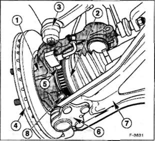 • Снимите тормозной диск -4-, см.п.15.4. • Выверните зажимной болт -8- и гайку шаровой Внимание: не повредите манжету шарового пальца. • Выверните зажимной болт крепления амортизатор-