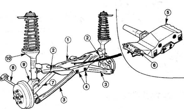 1 - Поперечная балка задней подвески 2 - Направляющие отверстия. Для точного расположения балки Р-3825 6 - Направляющий палец (4x4). Для точного расположения 7 - Передний поперечный рычаг 8 - Реактивная штанга 9 - Цапфа оси 10 - Амортизаторная стойка Элементы направляющей системы подвески задних вости регулирует наклон кузова при движении авто- 12.1. ПОДВЕСКА ЗАДНЕГО МОСТА