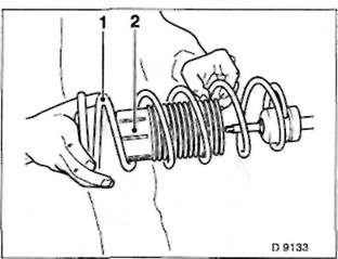 • Поднимите поперечную балку совместите направ- • Опустите автомобиль. • Проверьте на станции обслуживания колею задних охватывались и пружина не могла соскочить с при- Внимание! Гайку упора пружины отворачивайте • Отверните гайку упора пружины. • Снимите кожух упора. • Снимите упор и верхнюю тарелку пружины.