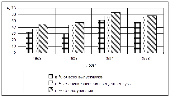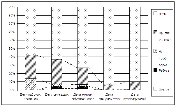 В 90-х годах – при том, что предпочтения выровнены, - дифференциация личных планов оказалась также ярко выраженной. Рис.1 наглядно представляет: доля планировавших поступить в вузы в той или иной группе молодежи тем больше, чем выше социально-профессиональный статус родителей. На среднее специальное и начальное профессиональное образование нацелены в первую очередь дети рабочих и крестьян. Такая зависимость наблюдается во всех регионах, где проводились обследования. На приведенных материалах наблюдаем, как молодые люди при формировании своих личных планов, вводя в рассмотрение существенные элементы реальности, корректируют свои устремления относительно сформировавшейся у них структуры привлекательности профессий. Полученные материалы позволяют предположить, что различия между предпочтениями и личными планами обусловлены не только тем, что подростки имеют различные склонности, трезво оценивают свои способности и т.п. Подойдя к рубежу окончания средней школы и определяясь в своих планах на будущее, подростки вполне реально рассматривают свои подлинные возможности в той системе социальных отношений, в которой они вступают в самостоятельную жизнь, и определенная часть молодых людей понижает планку своих притязаний.Распределение реальных жизненных шагов выпускников средних (полных) школ по социально-профессиональному статусу родителей носит также дифференцированный характер, при этом дифференциация при переходе от личных планов к жизненным шагам снова углубляется; например, в 1998 году стали студентами вузов 77,8% детей руководителей из 89,9% планировавших (86,5% осуществили свои намерения) и лишь 39,1% детей рабочих и крестьян из 57,8% имевших такие планы (удалось реализовать намерения 67,6% подростков). Это ярко показывает, какие социальные слои в большей мере пополняют учебные заведения высшего образования, а какие - учебные заведения, дающие специальности с меньшей квалификацией. Различия в судьбах, ожидающих выходцев из семей руководителей и специалистов (вузы – это их “экологическая ниша”), и судьбах, уготованных для тех, кто родился в семьях служащих, рабочих и крестьян, очевидны. В предыдущие годы обследований и в других регионах наблюдалась аналогичные картина. Ситуация, в которой находятся в системе образования дети из групп, занимающих относительно высокие позиции в обществе, показана на рис. 2. На протяжении всего периода обследований дети руководителей и специалистов интенсивнее представлены среди планирующих поступить в вузы, чем в числе всех выпускников школ, и в еще большей мере - среди поступивших в вузы. И наоборот, дети рабочих, крестьян и служащих реже встречаются среди планирующих поступить в вузы, чем в числе выпускников школ, и еще реже - среди поступивших (рис. 3). Так работает отбор, несомненно, носящий по сути своей социальный характер, при переходе от общего среднего образования к высшему.
