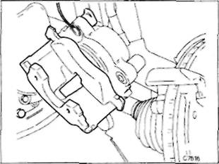 Внимание!Не нажимайте на педаль тормоза при снятых тормозных колодках, иначе поршень будет выдавлен из корпуса. Если по неосторожности пор- шень выдавлен из корпуса, то снимите скобу и собе- рите в специализированной мастерской.