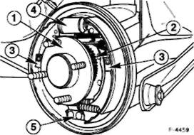 • Снимите вниз две прижимные пружины -3-. • Отсоедините стяжные пружины. Внимание! Перед снятием тормозных колодок реко- • Выведите обе колодки из колесного цилиндра -4-, Внимание! При извлечении колодок из тормозного