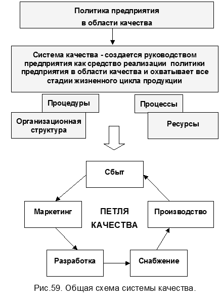 КОМПЛЕКС БАЗОВЫХ ИНФОРМАЦИОННЫХ ПРИМЕНЕНИЕ CALS-ТЕХНОЛОГИЙ В ОБЛАСТИ СТАНДАРТИЗАЦИИ Вданном подразделе приведено описание применения CALS- технологий для моделирования системы качества продукции, которая реализована в НИЦ CALS- технологий «Прикладная логистика». На основе CALS- технологий разработан комплекс базовых информационных моделей системы качества продукции предприятия. Качество является одной из важнейших характеристик продукта. В соответствии с определением ISO 8402 «… качество - совокупность характеристик объекта (продукции, процесса и др.), относящихся к его способности удовлетворить установленные и предполагаемые потребности». Качество продукции обеспечивается путем целенаправленной деятельности, осуществляемой в рамках системы качества и затрагивающей все стадии ЖЦ продукции. Система качества (ISO 8402) «.. это совокупность организационной структуры, ответственности, методик, процессов и ресурсов, необходимых для осуществления общего руководства качеством», т.е. аспектов управления, определяющих политику качества, цели, ответственность, а также реализующих управление качеством, планирование, обеспечение и улучшение качества. Основой системы качества являются: продуманная идеология, организационная структура, система документов и моделей деятельности всех работающих (от высшего руководства до рабочих). Общая схема системы качества приведена на рис.59. Стандарты ISO серии 9000 содержат общие требования к системе качества, которые необходимо реализовать в виде конкретных документированных процедур, выполняемых на предприятии. Эта работа может быть систематизирована и частично автоматизирована путем применения функционального, информационного моделирования и проектирования системы качества. Комплекс базовых информационных моделей системы качества продукции включает в себя набор базовых моделей в формате IDEF/0, описывающих типовые элементы системы качества в соответствии с ISO серии 9000: выполняемые функции, персонал, документацию, полномочия и обязанности (см. рис.60). В модели учтены основные аспекты обеспечения качества продукции на протяжении жизненного цикла продукта: - обеспечение качества благодаря определению потребности в продукции, с целью ее соответствия требованиям и возможностям рынка (это процессы маркетинга и изучения рынка); - обеспечение качества конструкции за счет встраивания в конструкцию свойств, которые влияют на бесперебойность работы изделия в переменных условиях производства и применения; - обеспечение качества благодаря поддержанию постоянного соответствия конструкции и реализации характеристик, заложенных в проекте (это планирование и разработка процессов, закупки, производство, проверки и все остальное (включая утилизацию несоответствующей продукции) вплоть до ее реализации); - обеспечение качества благодаря техническому обслуживанию продукции в процессе ее срока службы у потребителя (включая процессы установки, техническая помощь и обслуживание, а также другие аспекты послепродажной деятельности). Каждый блок на диаграмме понимается как отдельный тщательно определенный объект. Разделение такого объекта на его структурные части (декомпозиция) создает иерархическую совокупность диаграмм со своими четко оговоренными границами. Диаграммы не являются ни блок - схемам