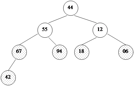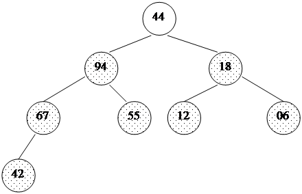 Пирамидальная сортировка является первым из рассматриваемых методов, быстродействие которых оценивается как O(n log n). В качестве вступления к основному методу рассмотрим перевернутую сортировку выбором. Во время прохода, вместо вставки наименьшего элемента в левый конец массива, будем выбирать наибольший элемент, а готовую последовательность строить в правом конце. Пример действий для массива a[0]... a[7]: 44 55 12 42 94 18 06 67 исходный массив 44 55 12 42 67 18 06 | 94 94 <-> 67 44 55 12 42 06 18 | 67 94 67 <-> 06 44 18 12 42 06 | 55 67 94 55 <-> 18 06 18 12 42 | 44 55 67 94 44 <-> 06 06 18 12 | 42 44 55 67 94 42 <-> 42 06 12 | 18 42 44 55 67 94 18 <-> 12 06 | 12 18 42 44 55 67 94 12 <-> 12Вертикальной чертой отмечена левая граница уже отсортированной (правой) части массива. Рассмотрим оценку количества операций подробнее. Всего выполняется n шагов, каждый из которых состоит в выборе наибольшего элемента из последовательности a[0]..a[i] и последующем обмене. Выбор происходит последовательным перебором элементов последовательности, поэтому необходимое на него время: O(n). Итак, n шагов по O(n) каждый - это O(n2). Произведем усовершенствование: построим структуру данных, позволяющую выбирать максимальный элемент последовательности не за O(n), а за O(log n) времени. Тогда общее быстродействие сортировки будет n*O(log n) = O(n log n). Эта структура также должна позволять быстро вставлять новые элементы (чтобы быстро ее построить из исходного массива) и удалять максимальный элемент (он будет помещаться в уже отсортированную часть массива - его правый конец). Итак, назовем пирамидой (Heap) бинарное дерево высоты k, в котором: · все узлы имеют глубину k или k-1, то есть дерево сбалансированное; ·