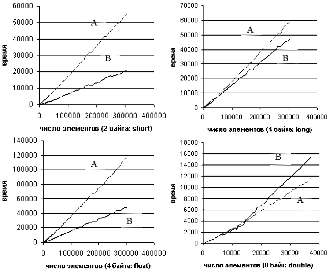 На диаграммах (рис. 24) изображены результаты сравнений поразрядной сортировки (линия В) и быстрой (линия А), причем использовалась функция sort() из библиотеки STL.