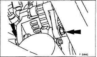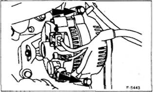 • Выкрутите нижний болт крепления и выньте гене- • Установите генератор, привинтите нижний болт • Опустите автомобиль на землю. • Затяните верхний болт крепления генератора с мо- • Приподнимите автомобиль. • Затяните нижний болт крепления с моментом • Смонтируйте клиновой ремень и покрытие ремен- • Смонтируйте головку поперечной рулевой тяги, • Смонтируйте внутреннее крыло автомобиля, • Установите правое переднее колесо так, чтобы • Подсоедините электрические провода к генератору • Смонтируйте воздушный фильтр, см.п.5.6. • Подключите провод "массы" батареи (-). • Установите на часах текущее время. • Задайте противоугонный код радиоприемника. Снятие генератора в автомобилях • Установите автомобиль на подставки. • Снимите нижнее покрытие двигателя, см.п.2.4. • Снимите клиновой ремень генератора, см.п. 1.19. • Снимите охладитель наддувочного воздуха,