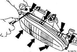 • Отвинтите соответственно по три винта от блока фары слева и справа и выньте вместе с пластмас- совой рамкой.