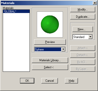 кнопка Materials Library..., призначена для переходу до діалогового вікна бібліотеки матеріалів Materials Library що викликається командою MATLIB;