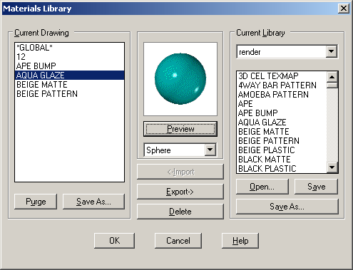 Preview — область перегляду зразка матеріалу, вибраного в списку Current Library або Current Drawing. Тип тіла, використовуваного для створення зразка (сфера або куб), вибирається із списку, що розкривається, розташованого нижче. Зразки матеріалів можна переглядати лише поодинці;