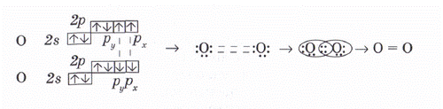 Электронды-графикалық формуласын қарасақ, валенттілік электрондар саны 6, оның екеуі дара күйінде, міне, осы электрондар екінші оттек атомындағы дәл осындай электрондармен екі жұп түзеді, яғни байланыс саны екі. Енді әр атом ядросын 8 электроннан айналатын болады. Сөйтіп, бұл мысалдан да көретініміз молекула түзілгенде аяқталған 8 электронды қабаттың пайда болуы. Оттек атомдарының тотығу дәрежелері нөлге тең, валенттіліктері ІІ-ге тең болады. Еселі байланыс дара байланысқа қарағанда беріктеу болады. Электрондардың электрон бұлттарының формаларын қолданып байланыстың түзілуін көрсетсек: