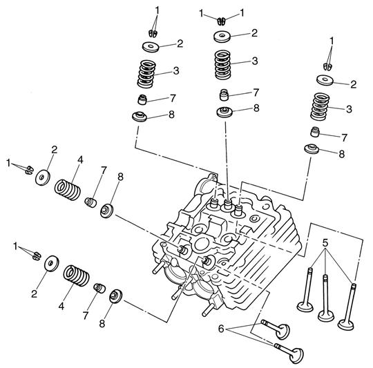 • налейте чистый растворитель (1) во впускные и выпускные отверстия головки цилиндров. • проверьте надежность уплотнения клапана. В седле клапана не должно быть утечки (2).