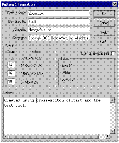 Этот диалог позволяет Вам определять следующую информацию для схемы: • Заголовок Схемы • Проектировщик • Компания • Авторское право • Дополнительные размеры схемы - включенный как часть распечатки информации образца. • Примечания - любая дополнительная информация, что Вы хотите напечатанный как часть информации схемы. • Шрифт - шрифт, который используется при печати информации образца. Диалог Информации схемы также показывает информации о текущем выборе ткани. Эта информация не может быть измененаменена этим диалогом. Выберите Дизайны Use For New, если Вы хотите, чтобы эти варианты использовались для новых образцов.