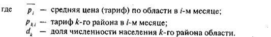 Из анализа динамики средних тарифов видно, что за полугодие тарифы выросли в 5,426 раза, в основном их рост произошел в июне, когда тарифы по сравнению с маем выросли в 3,153 раза. Полученные индексы по анализируемому виду услуг можно использовать для построения агрегатного ИПЦ по всем товарным группам. Поданный метод расчета применяется для определения индекса цен (тарифов) по однородным товарам (услугам) и не применяется для товарных групп, в которые входят товары с разными качественными характеристиками (например, отдельные виды одежды, обуви, тканей). Для расчета индекса цен по таким позициям в целом по региону принят алгоритм (табл. 14.5). Сводные индексы по области (к предыдущему месяцу) рассчитываются как средние арифметические из индивидуальных индексов, взвешенных на агрегированный показатель, определяемый как произведение доли численности населения на уровень тарифов каждого района (р d):