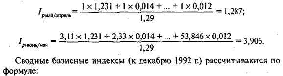 Такой метод расчета сводных индексов тарифов позволяет учитывать не только долю численности населения, потребляющего услуги по данным тарифам, но и уровень базисных цен (тарифов) в каждом районе. Дифференциация тарифов по районам значительная: от 0,13 до 2,25 в декабре и от 0,13 до 7,0 в мае, поэтому цепные сводные индексы, приведенные в табл. 14.4 и 14.5, отличаются как в мае, так и в июне, т. е. в те месяцы, когда тарифы изменялись практически во всех районах. Полученные таким образом сводные индексы по товарам или товарным группам далее агрегируются на уровне республики с учетом структуры потребительских расходов. В табл. 14.7 приведена в сжатой форме структура потребительских расходов по основным товарным группам.