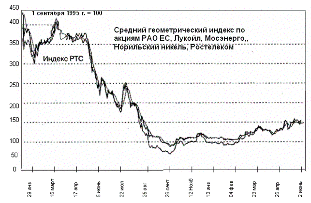 В качестве примеров фондовых индексов, которые рассчитываются по формуле простой геометрической средней, можно привести индекс VLA (Value Line Average), рассчитываемый компанией Arnold Bernhard & Со. с 1961 г., а также индекс SOBI, рассчитываемый Российским консультационным агентством «Соболев». Фондовые индексы, как правило, используются для определения относительного уровня цен на рынке и оценки их динамики, поэтому абсолютное значение индекса не представляет особого интереса. Гораздо важнее определить, как его значение изменяется относительно предыдущих значений. С этой точки зрения различные корректно построенные индексы дают приблизительно одинаковые результаты. Изменение цен большинства наиболее ликвидных акций происходит достаточно синхронно, поэтому по относительно небольшому числу акций с высоким уровнем торговой активности можно определить динамику цен на рынке. На рис. 18.1 приведен график динамики индекса РТС и индекса акций пяти компаний (РАО ЕЭС, ЛУКойл, Мосэнерго, Норильский никель и Ростелеком), рассчитанного по формуле простой средней геометрической, из которого видно, что относительная динамика обоих индексов различается весьма незначительно.