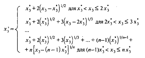 При исчислении индекса грамотности среди взрослого населения (в возрасте от 15 лет и старше) хimin принимается равным 0, а хimax = 100%. Индекс совокупной доли учащихся рассчитывается для лиц моложе 24 лет, а предельные значения доли принимаются такие же, как и в индексе грамотности (0 и 100%). Метод расчета индекса реального объема ВВП в расчете на душу населения более сложен. Реальный объем ВВП рассчитывается в долларах на основе паритета покупательной способности валют, а затем корректируется с учетом того, что для достойного уровня жизни необязательно иметь слишком высокий доход. В качестве порогового значения, достаточного для разумно высокого уровня благосостояния, принимается среднедушевой объем ВВП по миру в целом в 1995 г., равный 5990 дол. ППС: x*3 — 5990. Если фактический доход в данной стране (х3)превышает пороговый уровень, т. е. если х3 > х*3, то величина превышения дисконтируется исходя из предпосылки о том, что значимость более высокого дохода резко уменьшается. Дисконтированный доход (х*3)рассчитывается по следующим формулам: