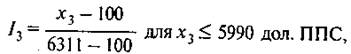 Если х3 £ x*3, то при расчете индекса реального объема ВВП (I3) берется фактическое значение этого показателя. Минимальное значение реального объема ВВП в расчете надушу населения принимается равным 100 дол. ППС, а максимальное дисконтированное значение составляет 6311 дол. США (ППС в дол. США). Таким образом: