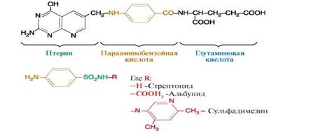 Рис. 3. Структура фолиевой кислоты и общая формула сульфаниламидов