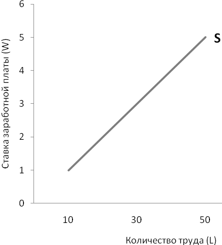 Рисунок 7.2 – Кривая спроса на труд Предложение труда также определяется потребностями людей трудоспособного возраста в нормальном воспроизводстве своих способностей и поддержании достаточного уровня благосостояния, а поэтому предложение, так же как и спрос, зависит от величины заработной платы. Однако зависимость здесь другая. В соответствии с рисунком 7.3., кривая предложения труда имеет положительный угол наклона: с ростом общего уровня заработной платы предложение труда увеличивается. Рыночное предложение труда для определенного вида деятельности при данной заработной плате есть сумма объемов предложения всех работников. Общее предложение труда в экономике зависит от численности работников, готовых продавать рабочую силу работодателям. Численность таких работников зависит от уровней рождаемости, смертности и миграции населения, физической способности быть производительным работником, доступности других источников существования (кроме зарплаты), личного выбора между работой и досугом, альтернативной стоимости наемного труда. Другие источники существования включают в себя пенсии, пособия, субсидии, проценты с вложенного капитала, дивиденды и любые другие доходы, для получения которых нет необходимости непосредственно работать.