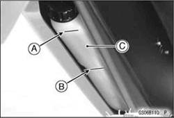 · Удалите собрание элемента из кожуха воздухоочистителя (см. Удаление Фильтрующего элемента воздушного фильтра в главе Топливной системы). · Отделите элемент от держателей элемента [B]. · Уберите элемент в ванне растворителя высокой температуры вспышки, и затем высушите это со сжатым воздухом или при сотрясении этого. · Визуально проверьте элемент для разрыва или разрывов. Если какая-либо деталь элемента повреждена, заменяет их новым После очистки элемента, насыщайте это с высококачественным маслом воздушного фильтра формы и отожмите лишнее масло. · Оберните элемент в чистую тряпку [B] и сожмите его столь же сухой насколько возможно. • Соберите элемент с держателями, и установите их в кожух воздухоочистителя.