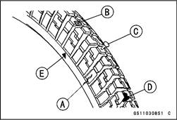 ○Check and balance the wheel when a tire is replaced with a new one. Wheel/Tire Damage Inspection • Remove any imbedded stones [D], nail [C] or other foreign Wear Indicator [E] • Visually inspect the tire for cracks [A] and cuts [B], and replace the tire if necessary. Swelling or high spots indicate internal damage, requiring tire replacement. • Visually inspect the wheel for cracks, cuts and dents damage. • If any damage is found, replace the wheel if necessary. 2-24 Периодический ремонт