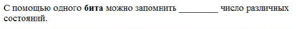 £ арифметических R физических £ текстовых £ логических 36. Задание {{ 37 }} ТЗ № 37 С поощью бита можно запомнить ___________ число разных состояний. £ 256 £ 8 £ 1 R 2 37. Задание {{ 38 }} ТЗ № 38