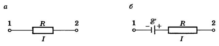 Рис. 1 Рассмотрим вначале однородный участок цепи (рис. 1, а). В этом случае работу по перемещению заряда совершают только силы стационарного электрического поля, и этот участок характеризуют разностью потенциалов Δ φ. Разность потенциалов на концах участка
