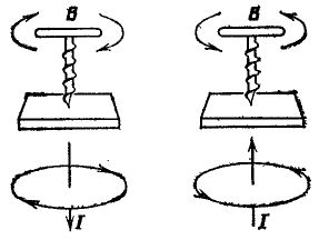 Нетрудно видеть, что обе формулировки правила буравчика совершенно равноценны и их можно одинаково применять к определению связи между направлением тока и направлением магнитной индукции поля при любой форме проводников.