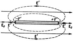 Если упомянутые условия не соблюдаются, векторы D и e 0 Е 0 не совпадают. На рис. 35 показано поле в пластине диэлектрика, перекошенной относительно плоскостей, несущих свободные заряды. Вектор Е ' перпендикулярен к граням пластины, поэтому Е и Е 0 неколлинеарны. Вектор D направлен так же, как Е, следовательно, D и e0 Е 0 не совпадают по направлению. Можно показать, что они не совпадают и по величине. Во всех рассмотренных выше примерах из-за специально выбранной формы диэлектрика поле Е ' было отлично от нуля только внутри диэлектрика. В общем случае Е ' может быть отлично от нуля и за пределами диэлектрика. Поместим в первоначально однородное поле стержень из диэлектрика (рие. 36). Вследствие поляризации на концах стержня образуются связанные заряды противоположных знаков. Их поле вне стержня эквивалентно полю диполя (линии Е ' показаны на рисунке пунктиром). Легко видеть, что результирующее поле Е вблизи концов стержня больше Е 0.