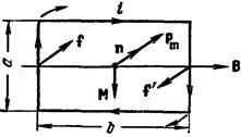 = iВ d l sin a) sin a = 0. На левый участок будет согласно закону Ампера действовать сила f = iBa, направленная за чертеж, на правый участок– такая же по величине, но обратно направленная сила f '. Эти силы образуют пару, момент которой равен М = f b = iBab. Учитывая, что ab равно площади контура S, а iS есть величина магнитного момента p m, можно написать M = p m В. (48.1) Эта формула совпадает по существу с формулой (39.3 Момент М стремится повернуть контур так, чтобы его магнитный момент р m выстроился по направлению поля В. Такая ориентация контура показана на рис. 88. В этом случае f 1 = f 3 = iBa, f 2 = f 4 = iBb. Направления всех сил лежат в плоскости контура. Видно, что вращательный момент в этом случае не возникает. Поскольку поле однородно, равнодействующая сил равна нулю; силы лишь растягивают контур, но сместить его не могут. Если повернуть контур на 180° (или изменить направление поля на обратное), то направления всех сил изменятся на противоположные, и они будут не растягивать, а сжимать контур.