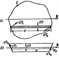 Покажем, что формула (48.1 M = p m В) справедлива и для плоского контура произвольной формы. Разобьем площадь контура на узкие параллельные направлению вектора В полоски шириной d h (рис. 89, а). На элемент контура d l 1 действует сила d f 1 = iB d l 1 sin a 1, направленная за чертеж. На элемент d l 2 действует сила d f 2 = iB d l 2 sin a 2, имеющая противоположное направление. Как видно из рис. 89 б, d l 1 sin a 1 = d l 2 sin a 2 = dh, то есть ширине полоски. Следовательно, силы d f 1 и d f 2 одинаковы по величине и образуют пару, момент которой равен d M = iB d h b, где b – длина полоски. Произведение b ×d h дает площадь полоски d S. Таким образом, d M = iB d S. Беря попарно силы, приложенные к противолежащим элементам контура, и суммируя их моменты, получим результирующий момент, действующий на контур: