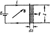 Согласно полученной нами формуле сила, действующая на контур с током в неоднородном магнитном поле, зависит от ориентации магнитного момента контура относительно направления поля. Если векторы p m и В совпадают по направлению (a = 0), сила положительна, т.е. направлена в сторону возрастания В ( Этот результат мы уже получили качественно с помощью рис. 91. Разумеется, кроме силы (48.8) на контур с током в неоднородном магнитном поле будет действовать также вращательный момент (48.3 М = p m´ В). Работа, совершаемая при перемещении тока в магнитном поле. Допустим, что провод с током может свободно перемещаться во внешнем магнитном поле. Это можно осуществить с помощью скользящих контактов между концами провода и остальными участками замкнутой цепи (рис. 92). Внешнее поле будем предполагать однородным и перпендикулярным к плоскости контура. При указанных на рисунке направлениях тока и поля сила будет направлена вправо и равна f = iBl где l – длина перемещающегося участка тока. На пути d s эта сила совершит над проводником работу d A = f d S = iBl d S Произведение l d s равно заштрихованной площади (рис. 92), a Bl d S – потоку магнитной индукции d Ф через эту площадку. Поэтому можно написать, что d A = i d Ф (49.1) где d Ф – поток магнитной индукции, пересекаемый проводником при его движении. Полученный нами результат легко обобщить на случай неоднородного поля. Для этого нужно разбить проводник на участки d l и сложить элементарные работы, совершаемые над