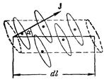 знать не только токи, текущие по проводам, но и молекулярные токи. Путь, позволяющий обойти это затруднение – введение величины, аналогичной вектору электрического смещения. Можно найти такую вспомогательную величину, которая связана простым соотношением с вектором В n определяется лишь макроскопическими токами. Чтобы установить вид этой вспомогательной величины, попробуем выразить фигурирующую в (44.2) сумму молекулярных токов через вектор намагничения магнетика J. В эту сумму должны войти только те молекулярные токи, которые оказываются «нанизанными» на контур, для которого вычисляется циркуляция. Как видно из рис. 77, элемент контура d l, образующий с направлением намагничения угол a, пересекает те молекулярные токи, центры которых попадают внутрь косого цилиндра с объемом SM cos a d l (SM – площадь, охватываемая отдельным молекулярным током). Если n – число молекул в единице объема, то суммарный ток, охватываемый элементом d l, равен i m nS mcos a d l. Произведение i m S m равно магнитному моменту р m отдельного молекулярного тока. Следовательно, выражение i m nS m представляет собой магнитный момент единицы объема, т. е. дает модуль вектора J, a i m nS mcos a – проекцию i l вектора J на направление элемента d l. Таким образом, суммарный молекулярный ток, охватываемый элементом d l, равен i ld l, а сумма молекулярных токов, охватываемых всем контуром: