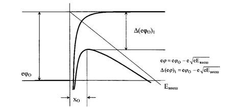 Термоэлектронная эмиссия –это процесс испускания электронов в вакуум при нагревании тела до значительных температур (~ 2000 К). При нагреве (Т>>0) часть электронов в результате взаимодействия с тепловыми колебаниями решетки переходит на более высокие энергетические уровни, в том числе и такие, которые позволяют им покинуть твердое тело. Термоэлектронная эмиссия характеризуется величиной плотности электронного тока j, определяемой формулой Ричардсона - Дэшмана: В точке хО: