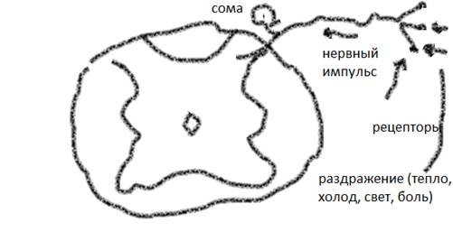 Рецепторы – в коже, мышцах, сухожилиях, стенках кровеносных сосудов и внутренних органов. Рецепторы – образования, воспринимающие любые изменения во внешней и внутренней среде. В рецепторе происходит преобразование энергии внешнего стимула в нервный импульс. Нервные импульсы поступают в спинной или головной мозг. Рецептор – окончание афферентного волокна. Задача афферентных нейронов — передавать информацию от рецепторов в ЦНС. Нервное волокно не передает ничего, кроме нервного импульса. Сома афферентного нейрона – округлая. Отсутствуют дендриты(длинные отростки). От сомы отходит короткий отросток, разветвляется на 2 веточки – одна идёт в ЦНС, вторая — на периферию. Информация происходит мимо сомы. Сомы афферентных нейронов выполняют метаболическую ф-ию, но не принимают участие в переработке информации.
