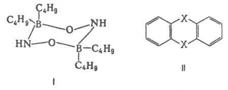 Важнейшая область применения данных о дипольных моментах молекул - структурные исследования, установление конформации молекул, конформационного и изомерного состава вещества, его зависимости от температуры. Величины дипольного момента молекул позволяют судить о распределении электронной плотности в молекулах и зависимости этого распределения от характера отдельных заместителей. В общем случае структурная интерпретация дипольный момент требует сравнения экспериментальных величин со значениями, полученными квантово-механическим расчетом либо при помощи аддитивной векторной схемы с использованием дипольных моментов отдельных связей и атомных групп. Последние находят либо по интенсивностям колебательных полос поглощения, либо путем векторного разложения дипольный момент некоторых симметричных молекул. Расчеты с использованием векторной аддитивной схемы могут учитывать различные проявления стереохимической нежесткости, например, затрудненное или свободной внутреннее вращение молекулы. Высокосимметричные молекулярные структуры, обладающие центром инверсии, двумя взаимно перпендикулярными осями вращения или осями, перпендикулярными плоскости симметрии, не должны иметь дипольный момент. По наличию или отсутствию дипольного момента молекулы можно в отдельных случаях выбрать для нее ту или иную структуру без каких-либо теоретических расчетов. Так, равенство нулю экспериментального дипольный момент димера аминооксидибутилборана (формула I) служит доказательством того, что он существует в виде устойчивой кресловидной конформации, обладающей центром инверсии. Наоборот, наличие дипольный момент у тиантрена (формула II, X = S) и селенантрена (II, X = Se), равных 1,57 Д и 1,41 Д соотв., исключает для них центросимметричную структуру, в частности плоскую.
