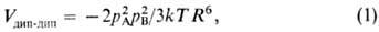 где aА и aB- средние статич. поляризуемости молекул А и В соответственно. Если поляризуемости молекул анизотропны, то в выражении для Vпол появляются дополнит. члены, зависящие от взаимной ориентации молекул. Межмолекулярное взаимодействие, связанное с переносом электронного заряда с одной молекулы на другую, близко по физ. смыслу к поляризац. межмолекулярному взаимодействию. Перенос заряда происходит при перекрывании электронных оболочек молекул, если их сродство к электрону различно. Перенос заряда можно наглядно рассматривать как "далеко зашедшую"поляризацию, однако энергия межмолекулярного взаимодействия, связанного с переносом заряда, |V|п.з по своему абс. значению существенно меньше | Vпол | и очень быстро (экспоненциально) стремится к нулю с увеличением R. Строго разделить вклады поляризации и переноса заряда в энергию межмолекулярного взаимодействия затруднительно, поэтому часто вычисляют суммарную величину, обозначаемую просто Vпол. Дисперсионное межмолекулярное взаимодействие определяется корреляцией движения электронов двух взаимодействующих молекул, в результате чего среднее расстояние между электронамиэтих молекул несколько увеличивается. Это приводит к уменьшению энергии их взаимодействия, т.е. к притяжению молекул. Дисперсионное взаимод. имеет универсальный характер: оно существует между любыми молекулами. Энергия дисперсионного взаимод. Vдисп двух атомов или сферически симметричных молекул при R>>l приближенно описывается ф-л о й Л о н д о н а: