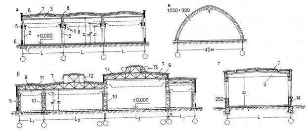 а- со сборным железобетонным каркасом; б- со стальным каркасом; в- с несущими конструкциями в виде деревянных клеевых трехшарнирных арок; с несущими кирпичными стенами и покрытием по сборным железобетонным балкам. По системе отопления – неотапливаемые и отапливаемые. По системам вентиляции — с естественной вентиляцией или аэрацией через специальные проемы в ограждающих конструкциях; искусственной приточно-вытяжной вентиляцией с помощью вентиляторов и системы воздуховодов; кондиционированием воздуха, т. е. с искусственной вентиляцией, создающей постоянные заданные параметры воздушной среды (температура, влажность, степень чистоты воздуха. По системам освещения — с естественным, искусственным или совмещенным (интегральным) освещением.