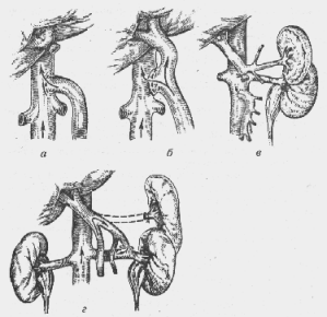 Рис. 23. Виды портокавальных сосудистых анастомозов (схема): а — прямой портокавальный по типу конец в бок; б — прямой портоканальный по типу бок в бок: в — мезентерико-кавальный; г — спленоренальный 2 суток наблюдения и консервативного лечения, с сохраняющейся симптоматикой; плановая операция выполняется в случае эффективного консервативного лечения приступа острого холецистита. — Какая симптоматика характерна для механической желтухи? Приступообразные боли типа печеночной колики, быстрое развитие желтухи после болевого приступа, появление неинтенсивного кожного зуда. При высокой обтурации желчных протоков на первый план выступает быстрое появление желту- хи, сильный кожный зуд, выраженная лихорадка, диспепти-ческие расстройства. Осложнениями холелитиаза чаще всего бывает гангрена и эмпиема желчного пузыря, холангит, пролежни стенки протока и рубцовые изменения, панкреатит. Перемежающуюся желтуху можно объяснить вентильным камнем холедоха. Холедохолитиаз диагностируют примерно у 10—20% больных. При выраженной механической желтухе предпочтение отдается чрезкожной чрезпеченочной холангиографии, которая позволяет контрастировать всю желчевыделительную систему. — К чему приводит развитие Рубцовых стриктур внепеченоч-ных желчных протоков? Если рубцовые сужения внепеченочных протоков имеют просвет менее 3 мм, развивается застой желчи, развитие желчной гипертензии, образование конкрементов и замазки и, в конечном счете, механической желтухи. — Какие возникают показания для интраоперационной холангиографии и холедохотомии? Интраоперационное контрастирование холедоха показано при механической желтухе, расширении общего желчного протока, при клинике холедохолитиаза, при стриктурах или новообразованиях большого дуоденального сосочка. Показания к вскрытию и ревизии общего желчного протока: пальпаторное обнаружение камня, увеличение диаметра протока, эпизоды желтухи, холангит, панкреатит в анамнезе, мелкие камни в желчном пузыре при широком пузырном протоке. — Какие существуют методы наружного дренирования желчных путей? Дренирование желчных протоков производят: для удаления инфицированной желчи при холангите; с целью временной декомпрессии желчных путей при воспалительных изменениях гепатикохоледоха, поджелудочной железы и фатерова сосочка; при невозможности завершить холедохотомию другими способами; для предупреждения рубцовых изменений желчных протоков после наложения на них швов, билиодигестивных анастомозов и пластических операций; у больных с желтухой для отведения желчи. Возможно дренирование желчных путей Т-образной трубкой по Керу; одноствольными трубками по Вишневскому, Кер-те, Холстеду—Пиковскому; наружное транспапиллярное дре- нирование по Долиотти, Т-образным дренажем по Мойнига-ну—Шампо, Каттеллу, расщепленным дренажем Пиковского (рис. 24). Выведение внутреннего конца транспапиллярного