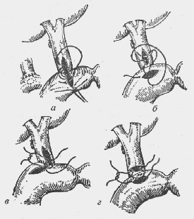 Рис. 26. Наложение супрадуоденального холедоходуоденоанастомоза: в — способ Зассе—Юраша; б — способ Флеркена; в — способ Финстевера; г — способ Роуленда—Мирнзн