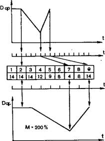 Рис. 5.19. Электронный метод изменения масштаба мера (адреса) ячеек памяти, а цифры в нижней части таблицы—величины значений оптической плотности, записанные в соответствующие ячейки определенным числом (кодом). На графиках 5.19, г дана последовательность импульсов, разрешающих вывод данных из устройства магнитной памяти. На графиках 5.19, д показаны кривые изменения оптической плотности, записанные на фотоформе по строке изображения. Современные ЭЦМ позволяют в широких пределах изменять масштаб репродуцирования: от пятикратного уменьшения (20%) до 40-кратного увеличения (4000%). В ЭЦМ могут быть записаны два вида фотоформ: полутоновые и растровые. Растровые фотоформы записывают либо с использованием контактных растров, либо электронным путем